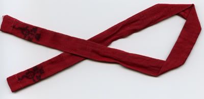 I forgot to mention, I'm going to be making some more of these pretty soon. They're cloth, usually about a centemeter wide and about thirty-five centemeters long. The Flamel will be less smudged, as the one in the scan is my personal hair tie and has undergone much use. The cloth will probably also be a lighter red. They make great hair ribbons/ties and, for those of you with short/little hair, they make great bookmarks as well. I also have some black and white cloth lying around, so I might make some with the flame array (if I can manage to draw it or something that could pass for it that small) and/or the Oroborus (if I can find something to draw with that will show up on black cloth) as well.